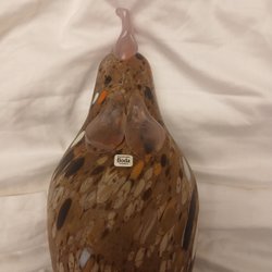 Färgstark träfågel i form av en tukan. Fågeln har detaljerade färger i blått, gult, orange och grönt. Den är tillverkad av trä och har en slät yta.