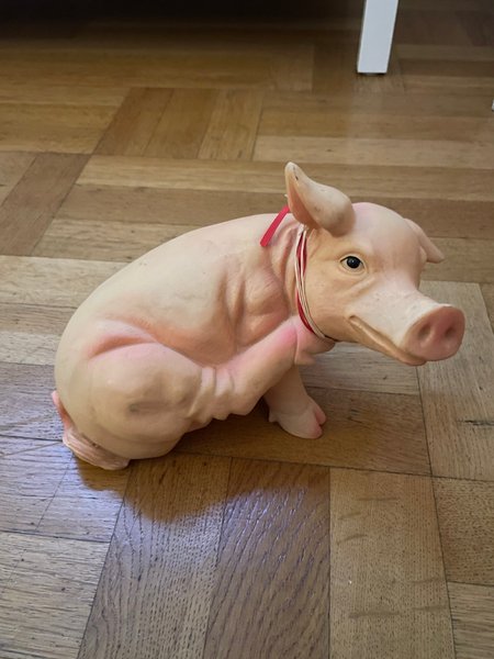En söt gris staty med ett rött och vitt band runt halsen. Perfekt som dekoration.