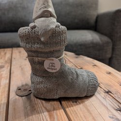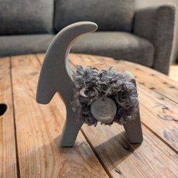 Dekorativ släde i betong med fårskinnsimitation och en liten berlock med texten "God Jul".
