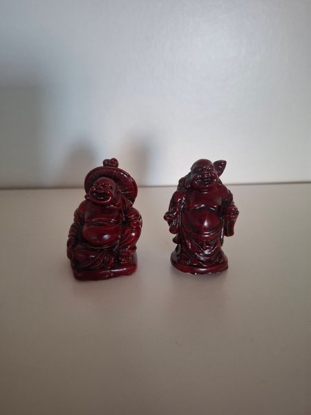 Två dekorativa Buddha statyetter i röd färg. Perfekt för att skapa en lugn och harmonisk atmosfär i ditt hem.