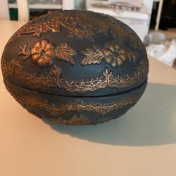 En söt, äggformad prydnadsask med blommönster och guldfärgade detaljer. Asken står på tre små fötter och har ett gångjärn.