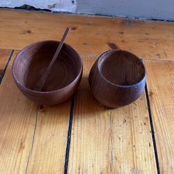 Två ljusstakar/ skål i metall. Ljusstakarna är trekantiga med rundade hörn och har en fördjupning i mitten för ljus. De är tillverkade av rostfritt stål. 18/8