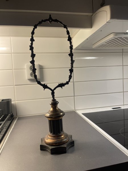 Säljer en vacker och dekorativ antik ställning/ fot som håller uppe en spegel eller en ram, som troligtvis från sent 1800-tal eller tidigt 1900-tal. Stilen är inspirerad av rokoko eller barock, med utsmyckade detaljer och en elegant, patinerad yta.