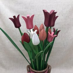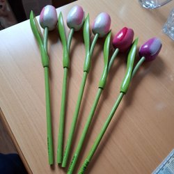 Dessa trätulpaner är en tidlös inredningsdetalj. Varje tulpan är handgjord och har en unik karaktär. De är lämpliga för att dekorera alla rum och ger en touch av färg och natur. Tulpanerna är tillverkade av trä och har en längd på 56 cm.