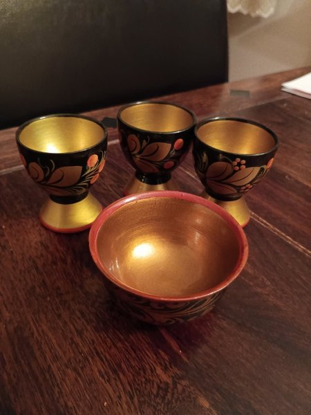 Sovjetisk vacker handarbete,3 äggkoppar,och en liten skål, perfekt skick,