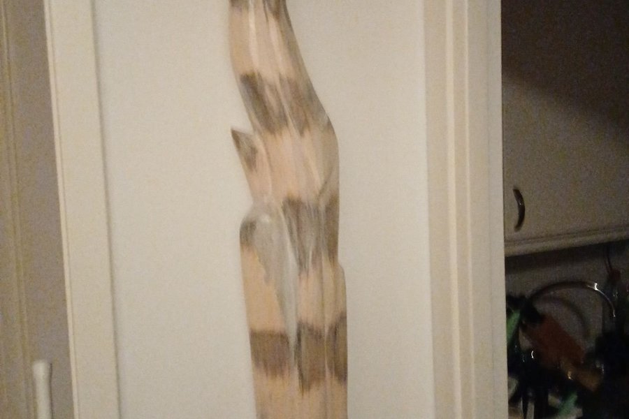 En träfigur formad som en katt. Katten har en långsträckt kropp och är målad i ljusa och mörka ränder. Ansiktet har blå ögon och en röd nos.