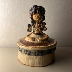 Vacker vintage smyckesask i koboltblått porslin med gulddetaljer och romantiskt motiv på locket. Står på fyra små ben. Märkt undertill med krona och “PM Import”, vilket är ett exportmärke för dekorativt tyskt porslin från ca 1950 tal.