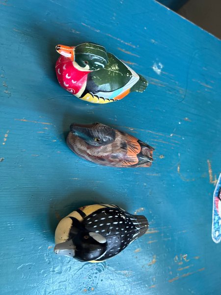 Set med 3 dekorativa träfåglar. Fåglarna är målade i olika färger och mönster. En är i trä två är i plast.