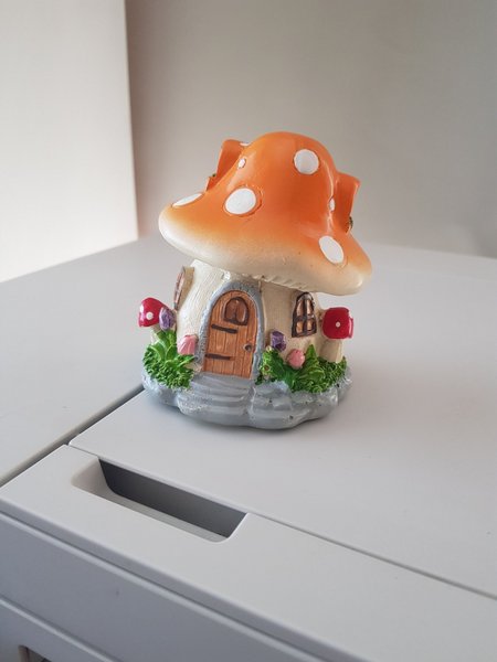 Svampformad figurin med detaljer som dörr, fönster och blommor. Passar som dekoration i hemmet. 8x9 cm
