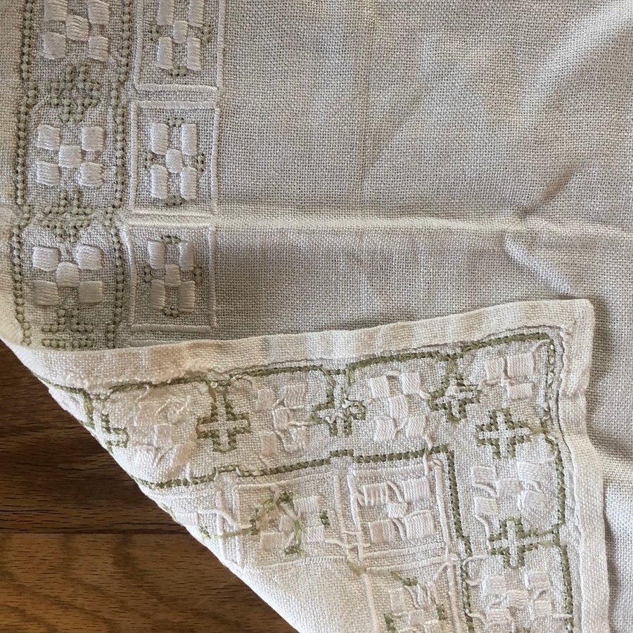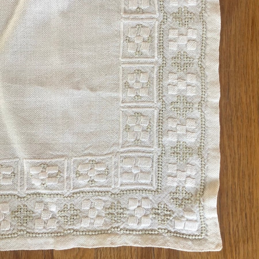 -En vacker vit duk med broderade detaljer i vit och ljus grå/grön.