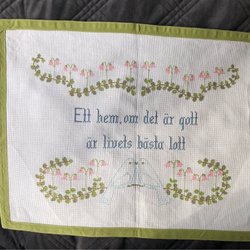 En fin blå duk från Älvsborgs läns Hemslöjdsförening. Verkar vara från 1979 enligt märkning. Ca 36 x 36 cm. Verkar vara i bomull/linne. Fin som brödduk.
