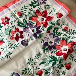 En alldeles fantastisk duk i rejäl bomull. Mycket bra skick. En diffus liten blå möjligtvis tryckfärgsrest bredvid en grön prick. Ej blekt. Se bild på fläcken som knappt syns.