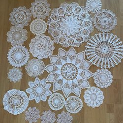 Ett set med vita handvirkade dukar i olika storlekar och mönster.