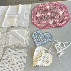 Ett sortiment av broderade textilier med varierande blommönster och utföranden. Inkluderar dukar, löpare och mindre broderade stycken. Perfekt för den som uppskattar handarbete och vill addera en vintage touch till hemmet.