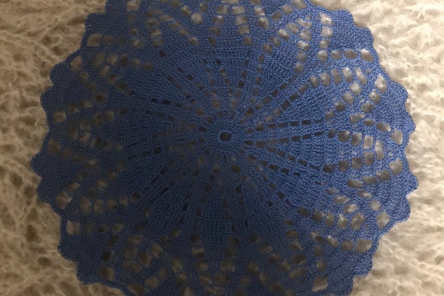 En vacker, blå virkad duk. Perfekt som dekoration.