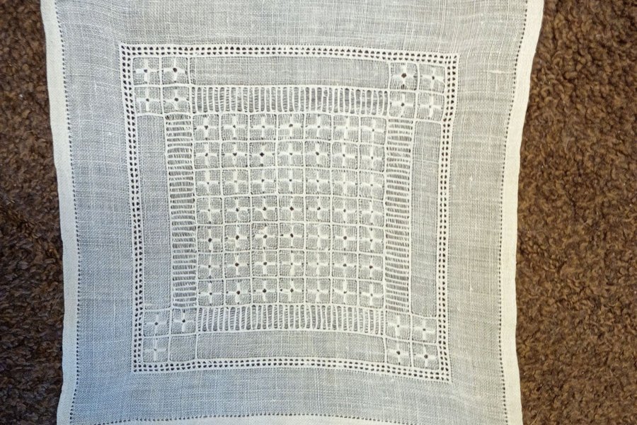 Duken är handbroderad med ett detaljerat mönster.Brozerad med hålsöm. Den har en fyrkantig form och är tillverkad av ett ljust tyg.