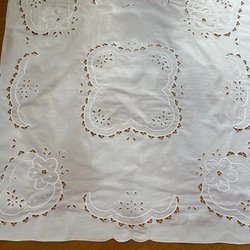 En vit duk med ett vackert mönster. Perfekt för att duka fint till middagen eller festen. Diskret monogramsignerad i ena hörnet. Osäker på material.