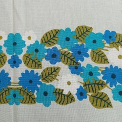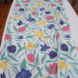 Retroduk med ett tryckt mönster av rutor i rosa, gult och blått med olika motiv. Duken har en vit bottenfärg. Ca 120x125 cm. Använd, så prickar och fläckar förekommer.Fin att duka med till vår och påsk.