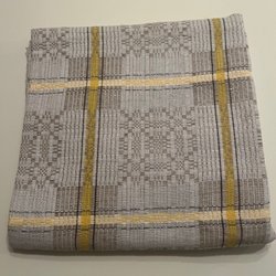 Stor gul och vitmönstrad linneduk som passar perfekt som påskduk.