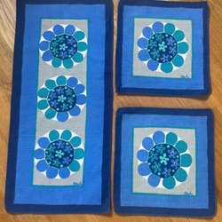 Duk från 60-70 talet med blommönster i blått, turkost och grått. Formgivare Bodil Wallman som gjort sig känd som mönsterformgivare till många alster. Signerad ”BW” i ena hörnet. Passar perfekt för att liva upp vilket rum som helst.