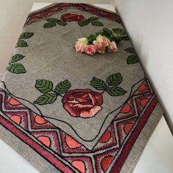 I härliga pastelliga färger är denna duk broderad med ett mycket vackert mönster
