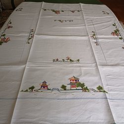 En rund duk, 140 cm i diameter, kan vara en Almedahls, märkningen saknas, otroligt fint skick, färgerna är så fina.