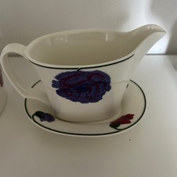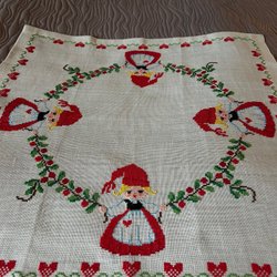 En vacker retro”revinnäistä”bordslöpare med ett blommönster i rosa. Den har en blå kant.vilket jobb!