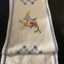En broderad duk med blommönster.