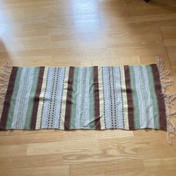 En löpare med fransar. Löparens färger är beige med inslag av rött, gräddvitt,brunt och blått.