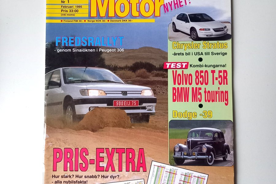 Tidning från Februari 1995. Innehåller artiklar om Opel Omega, BMW Compact, MG RV8, Chrysler Stratus, Volvo 850 T-5R, BMW M5 touring och Dodge -39.
