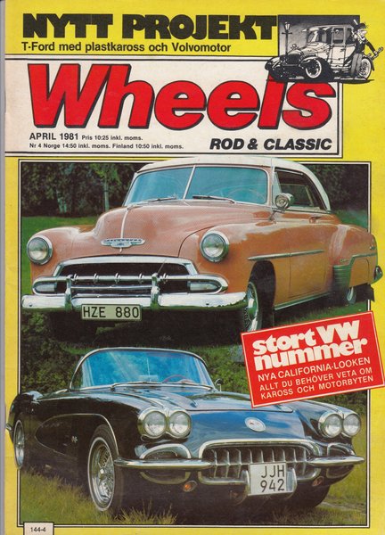 Tidningen Wheels från April 1981. Innehåller artiklar om T-Ford med plastkaross och Volvomotor, samt ett stort VW-nummer med fokus på nya California-looken och information om kaross- och motorbyten.