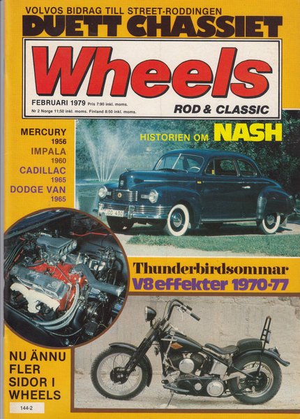 Wheels tidning från Februari 1979. Innehåller artiklar om Mercury 1956, Impala 1960, Cadillac 1965, Dodge Van 1965, Historien om Nash och Thunderbirdsommar V8 effekter 1970-77.