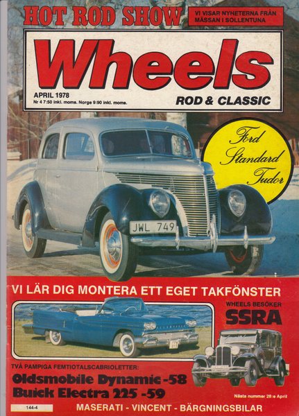 Tidning Wheels från April 1978. Innehåller artiklar om Hot Rods och klassiska bilar, inklusive Ford Standard Tudor, Oldsmobile Dynamic-58 och Buick Electra 225-59. Reportage från mässan i Sollentuna och ett besök hos SSRA. Artiklar om Maserati, Vincent och bärgningsbilar.