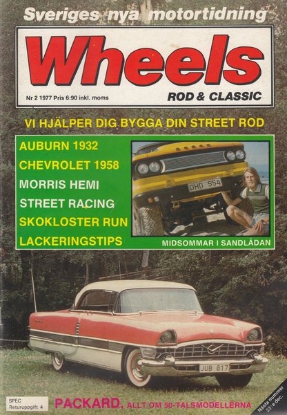 Tidning Wheels från 1977. Innehåller artiklar om Auburn 1932, Chevrolet 1958, Morris Hemi, Street Racing, Skokloster Run, Lackeringstips och Packard 50-talsmodeller.