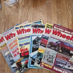 Ett parti Wheels tidningar från 1981. Innehåller reportage om bland annat Dodge Custom Royal, Corvette Stingray, Ford Mustang Boss 351, Ford Mustang '65 och Buick Roadster.