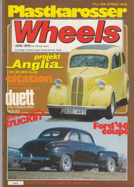 Tidningen Wheels från Juni 1979 med artiklar om Projekt Anglia, Chevrolet Citation, Volvo Duett och Ford '40 Coupe.