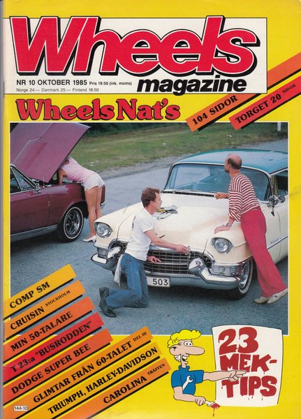 Tidning Wheels, NR 10 OKTOBER 1985. Innehåller artiklar om Comp SM, Cruisin Stockholm, Min 50-talare, T 23:a "Busrodden", Dodge Super Bee, Glimtar från 60-talet, Triumph, Harley-Davidson, Carolina Träffen. 104 sidor.