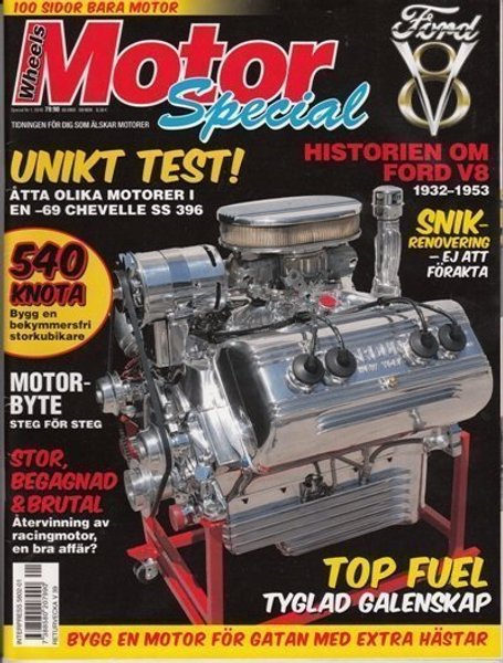 Tidningen Wheels Motor Special med fokus på motorer. Innehåller artiklar om bland annat Ford V8 1932-1953, motorbyte steg för steg, och byggnation av motorer.