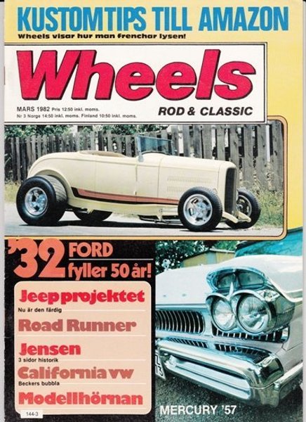 Tidningen Wheels Rod & Classic från mars 1982. Innehåller artiklar om Kustomtips till Amazon, '32 Ford som fyller 50 år, Jeepprojektet, Road Runner, Jensen med 3 sidor historik, California VW (Beckers bubbla) och Modellhörnan. På omslaget syns en Mercury '57.