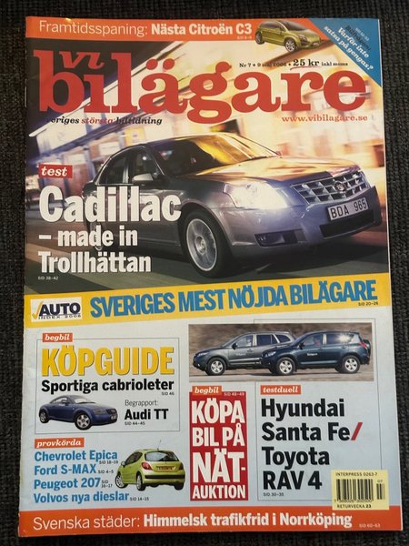 Tidning Vi Bilägare från 2006. Innehåller tester av Cadillac, Hyundai Santa Fe/Toyota RAV 4 och reportage om Audi TT. Interpress 0263-7
