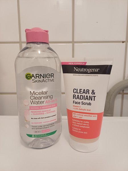 Micellar vattnet är bara använt 1 gång, skrubben är ca halva kvar.