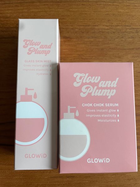Glow and Plump Glass Skin Mist ger omedelbar lyster, förbättrar elasticiteten och återfuktar. Glow and Plump Chok Chok Serum ger omedelbar lyster, förbättrar elasticiteten och återfuktar. Båda produkterna är från GLOWiD.