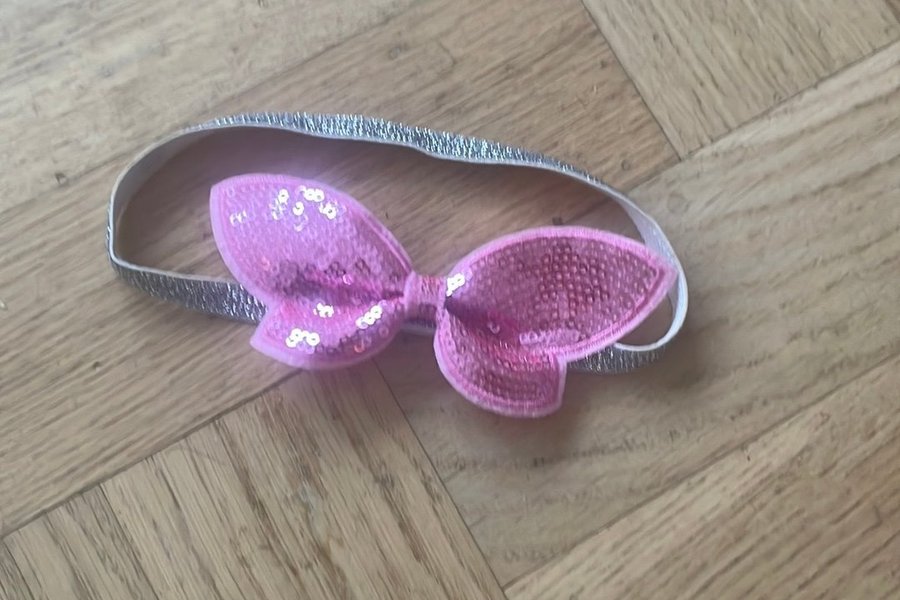 Ett sött hårband med en rosa paljettrosett. Hårbandet är silverglittrigt. Passar ett barn under 1 år.