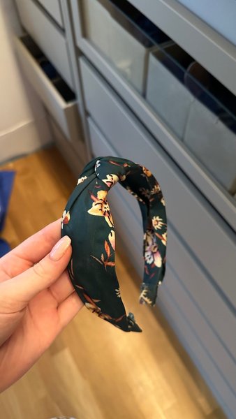 Ett mörkgrönt hårband med ett blommigt mönster. Hårbandet har en knutdetalj upptill.