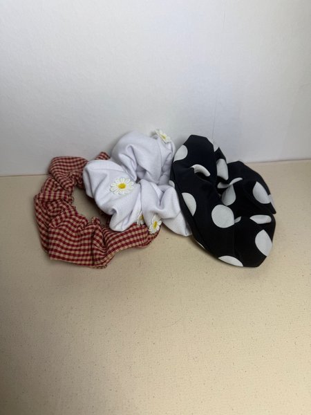 Ett set med tre scrunchies i olika mönster. En röd och beige rutig, en vit med små blommor och en svart med vita prickar.
