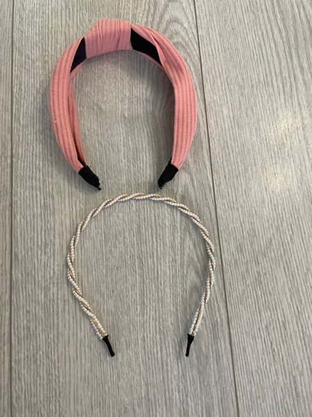 Två hårband. Ett rosa hårband med knutdetalj och ett hårband med pärlor och guldfärgade trådar.