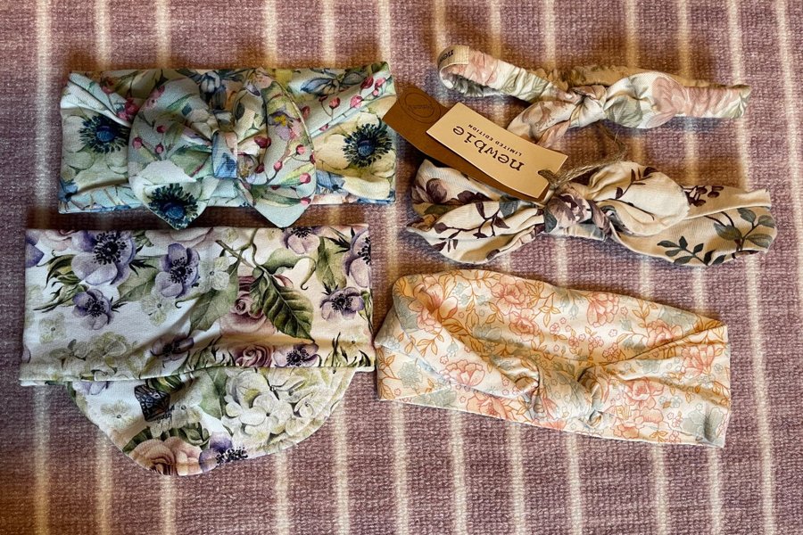 Fem stycken blommiga hårband i olika mönster. Ett av hårbanden är ett pannband med knut framtill. Ett annat är ett smalare hårband med en rosett. Ett tredje är ett brett pannband med en knut framtill. Ett fjärde är ett smalare hårband med en rosett. Det femte är ett brett pannband med en knut framtill.