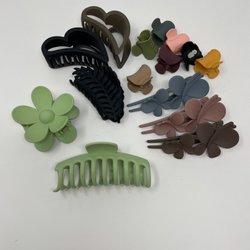 Ett sortiment av hårklämmor i olika storlekar och färger. Perfekt för att skapa olika frisyrer och hålla håret på plats.