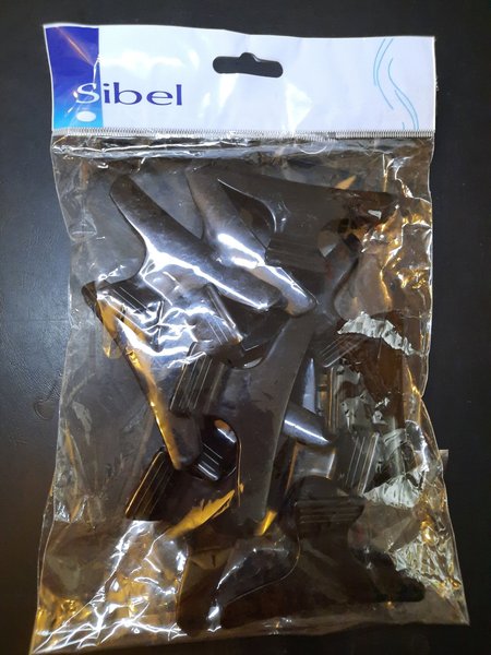 Hårklämmor från Sibel. Förpackningen innehåller flera svarta hårklämmor.