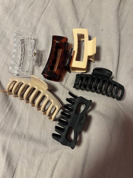 Set med sex olika hårklämmor i varierande färger och stilar. Perfekt för att skapa olika frisyrer och hålla håret på plats.